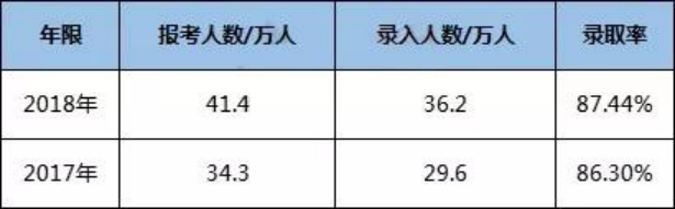以广东为例:2018 年广东成人高考报名人数达到 41.4 万,最终录取共约有 36.2 万人,录取率为 87.4%,比去年提高了 1.14%。