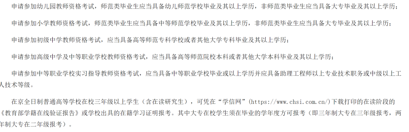 我们从北京市的中小学教师资格考试报名公告里面可以看到,公告报名条件要求是大学专科或本科以上学历,这其中并没有强制要求全日制的学历。其实在绝大部分情况下,只要没有特别标明仅限全日制学历报考,那么所有专升本的方式,包括自考专升本或者成人继续教育的专升本学历,都完全符合报名条件。